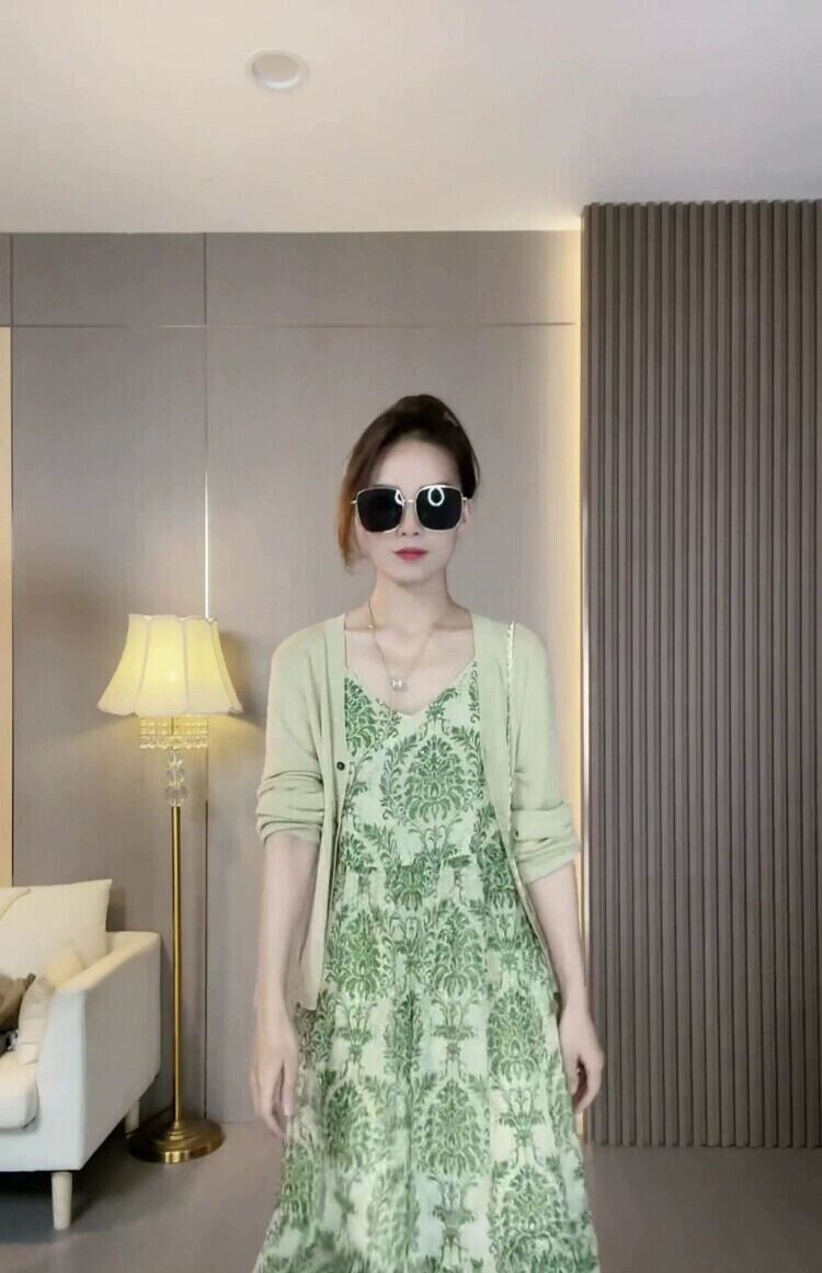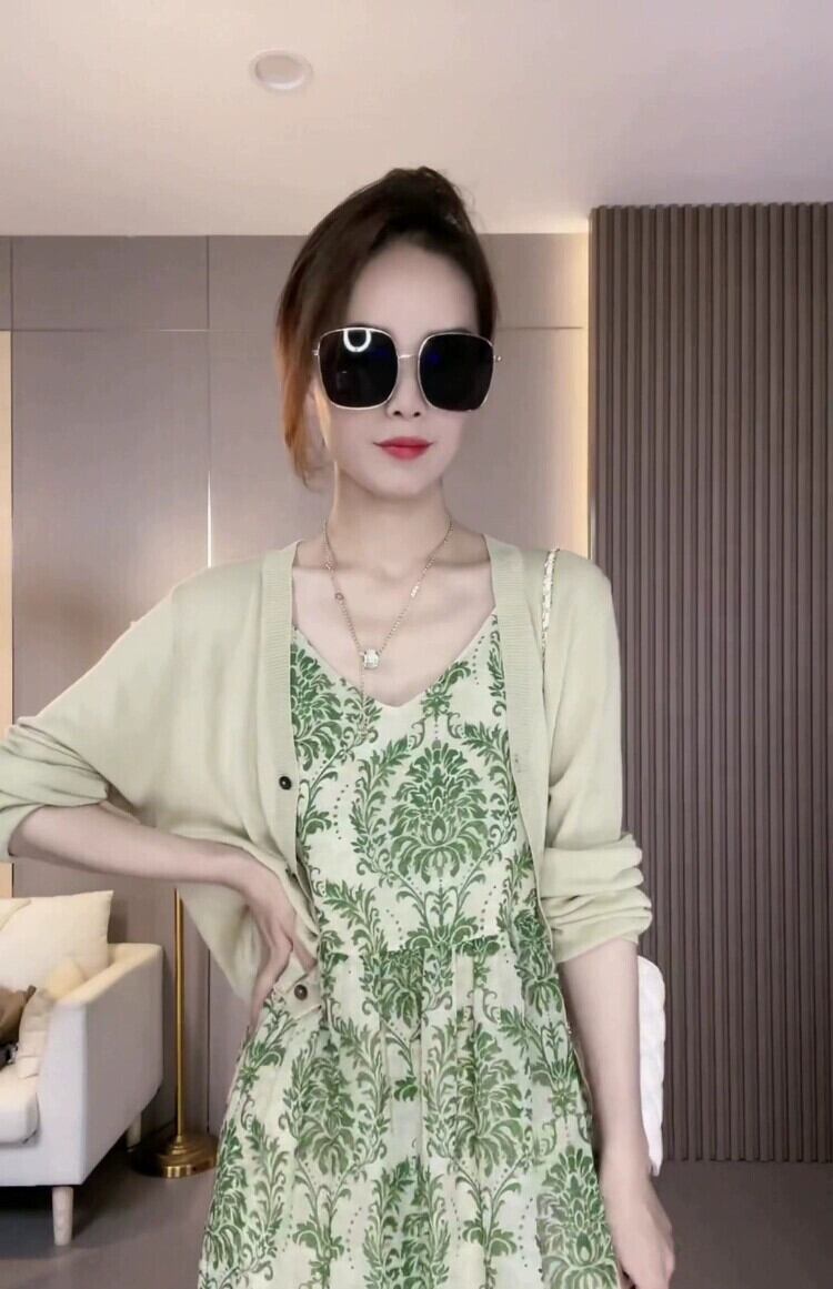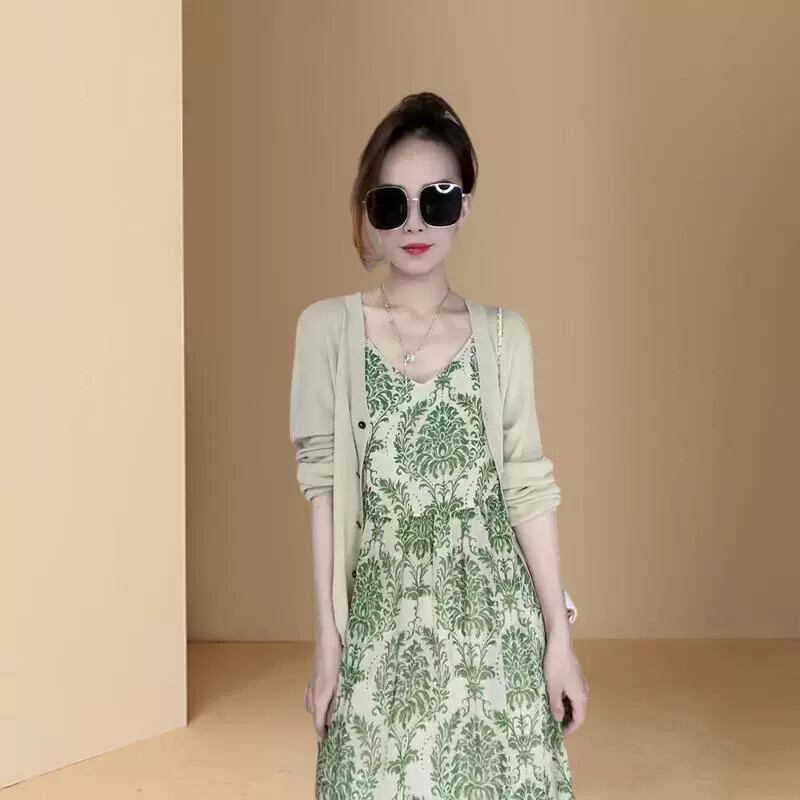 色:グリーンカーディガン+グリーン花柄サスペンダースカート【気質のある貿易カウンター/国際有名大型モデル/広州十三線欧州駅/大きいサイズ】