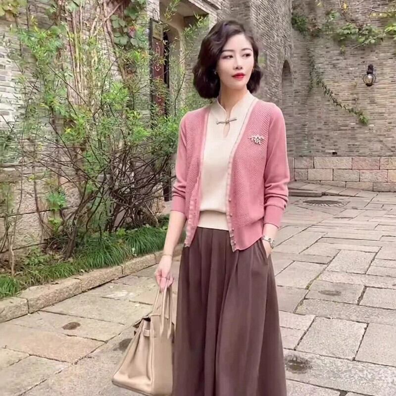 色:ピンクのトップス+ブラウンのスカート[カウンター高級品永貿易高級品/高級国際有名品クリアランスセール/広州十三線欧州駅/シルクシフォン],カーキトップス+コーヒースカート【春・秋・冬・春夏秋冬/春夏秋冬服/年齢軽減・レベル感/ママシルク・コットン・リネン・ラミー】